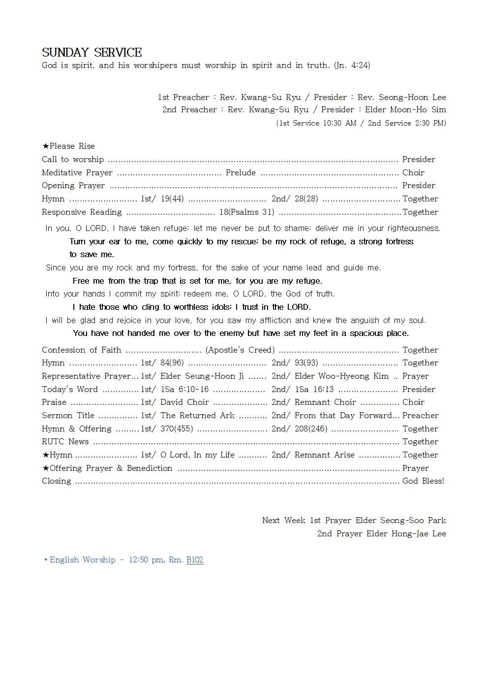 2nd Preacher : Rev. Kwang-Su Ryu / Presider : Elder Moon-Ho Sim