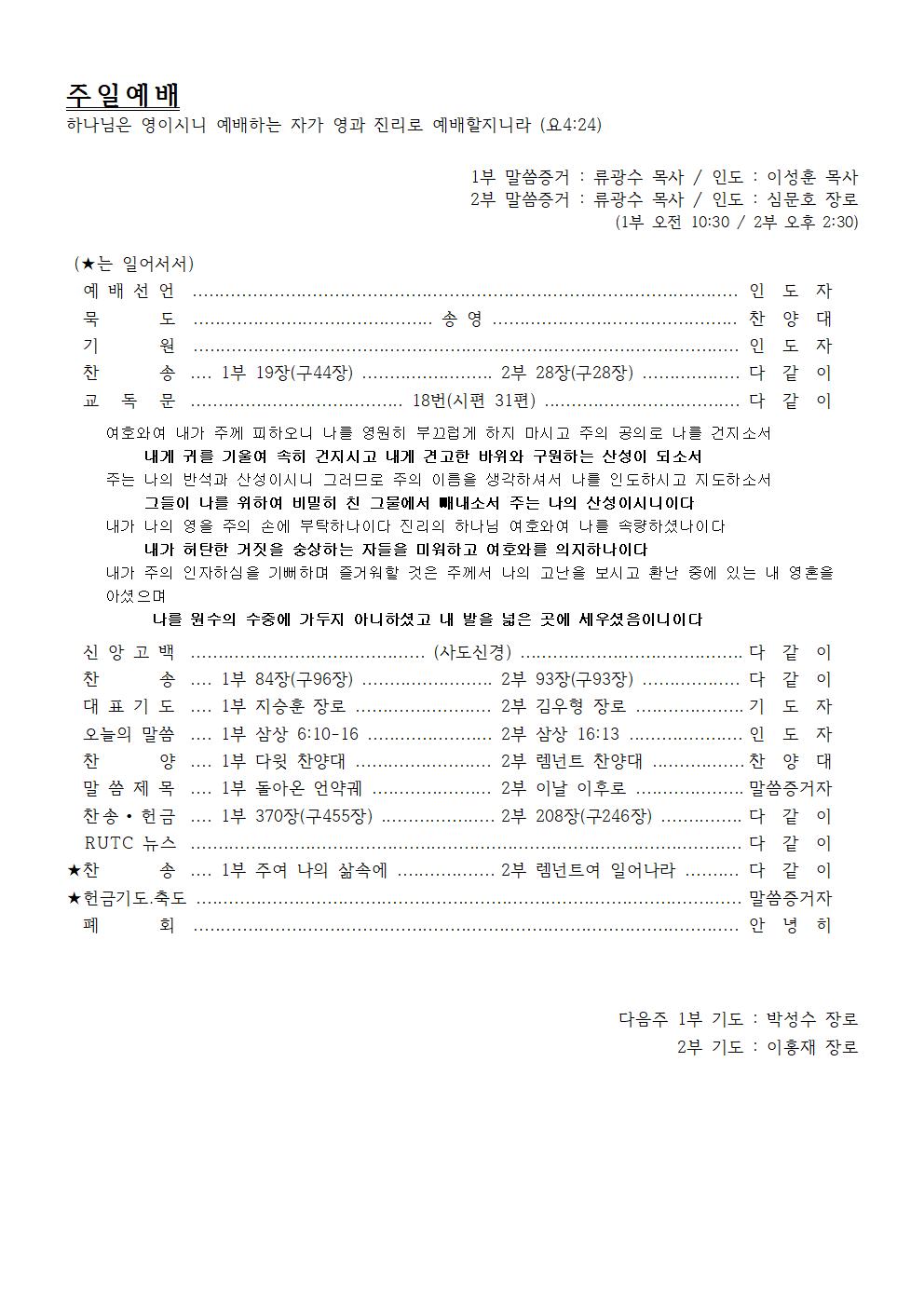 찬송∙헌금 ……. 1부 370장(구455장) ………………… 2부 208장(구246장) …………… 다 같 이