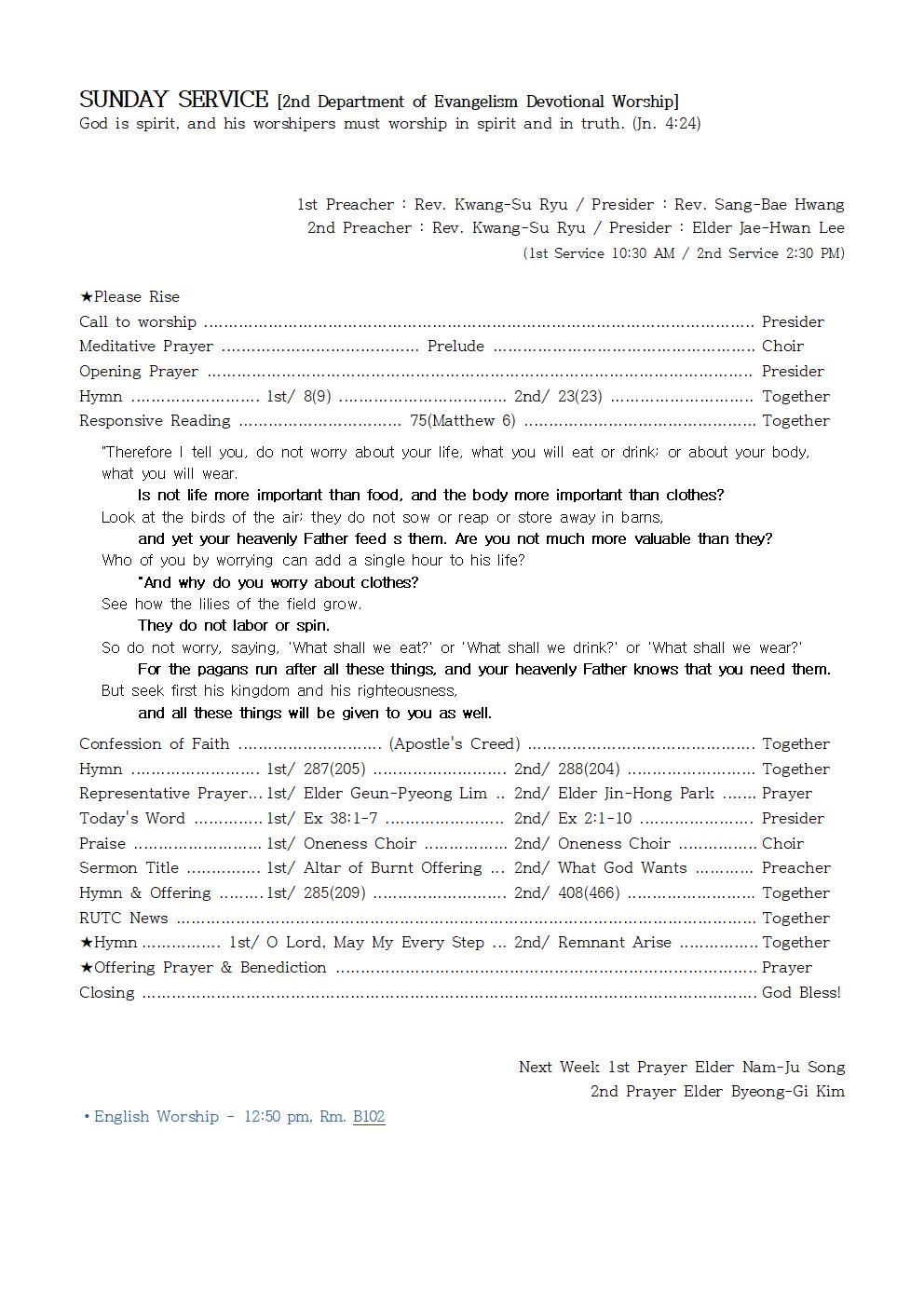 2nd Preacher : Rev. Kwang-Su Ryu / Presider : Elder Jae-Hwan Lee