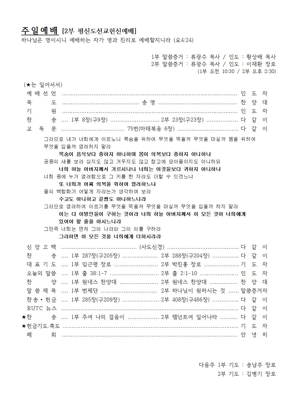 교   독   문 ……………………………… 75번(마태복음 6장) ………………………….. 다 같 이