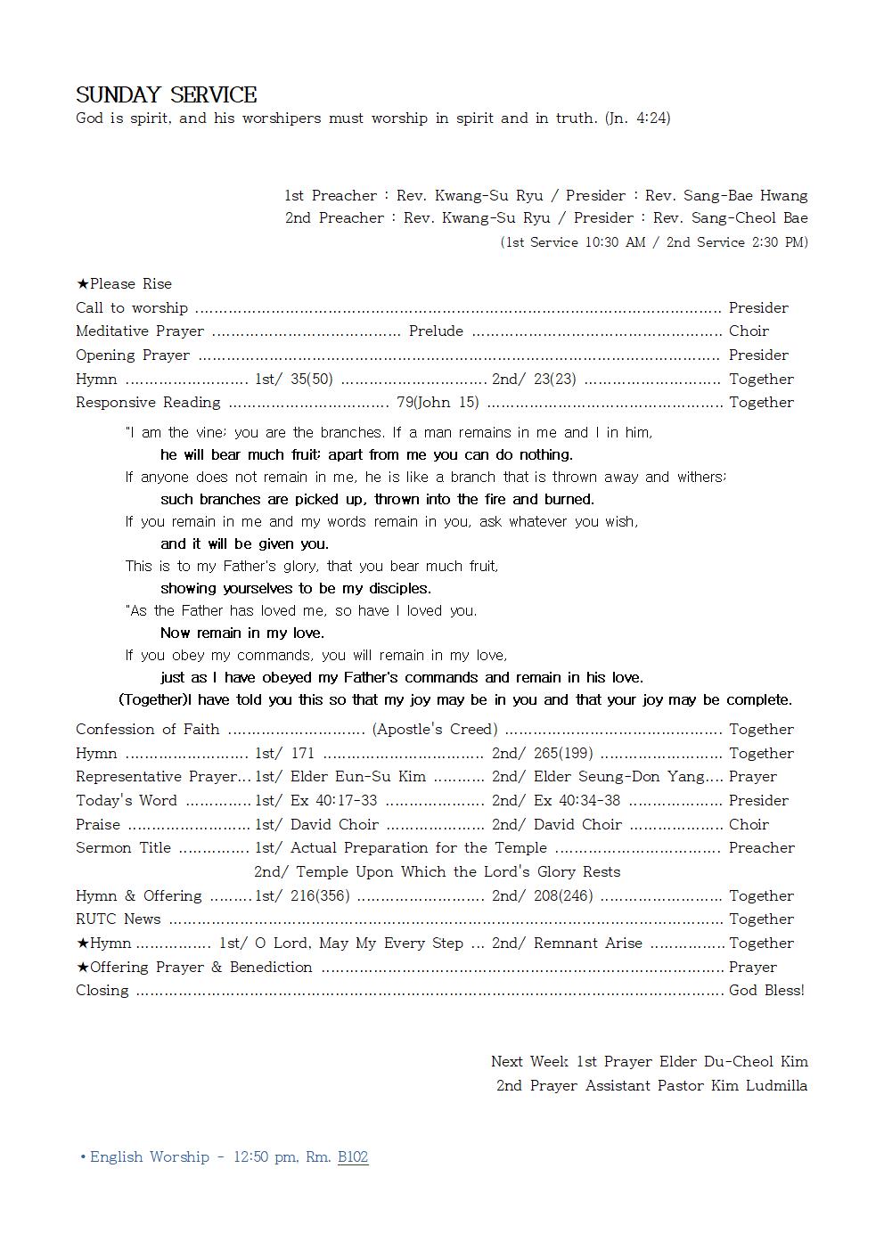 2nd Preacher : Rev. Kwang-Su Ryu / Presider : Rev. Sang-Cheol Bae