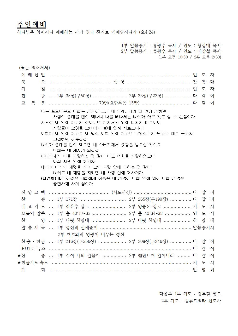 찬송∙헌금 ……. 1부 216장(구356장) ……………… 2부 208장(구246장) ………… 다 같 이
