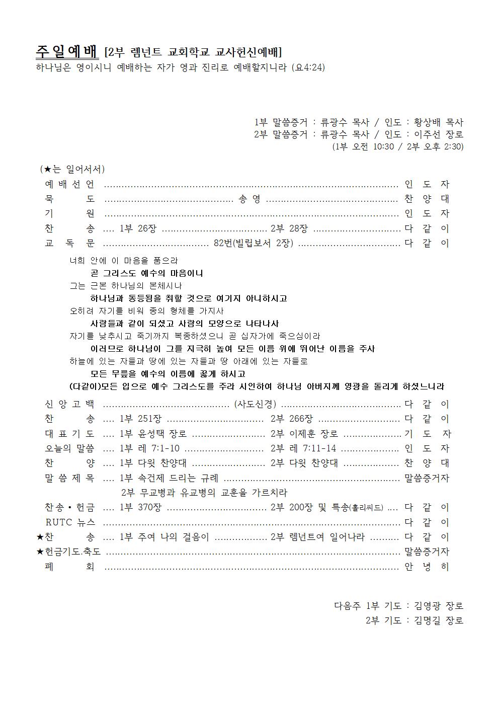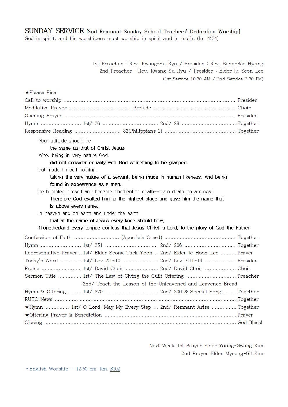2nd Preacher : Rev. Kwang-Su Ryu / Presider : Elder Ju-Seon Lee