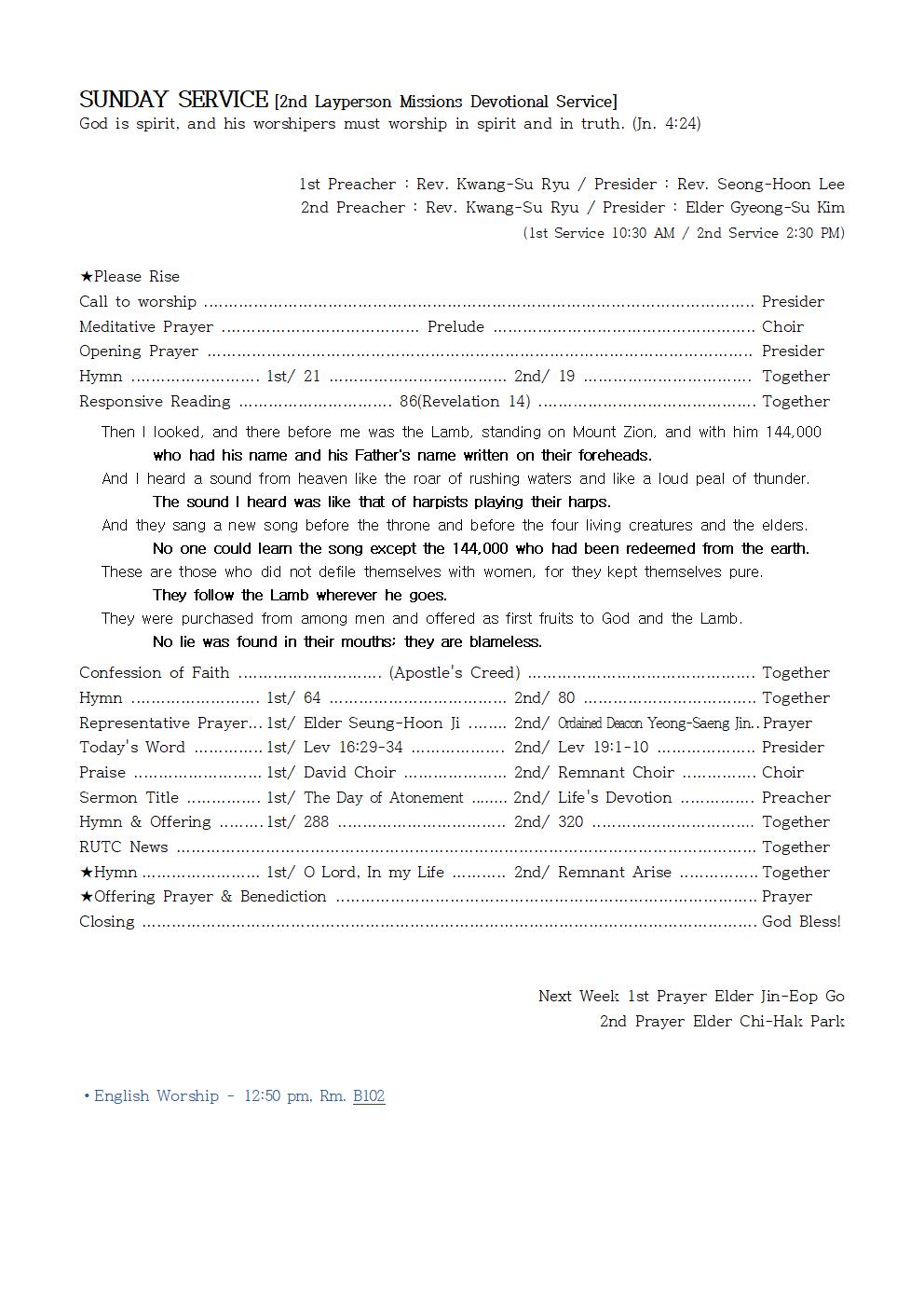 2nd Preacher : Rev. Kwang-Su Ryu / Presider : Elder Gyeong-Su Kim