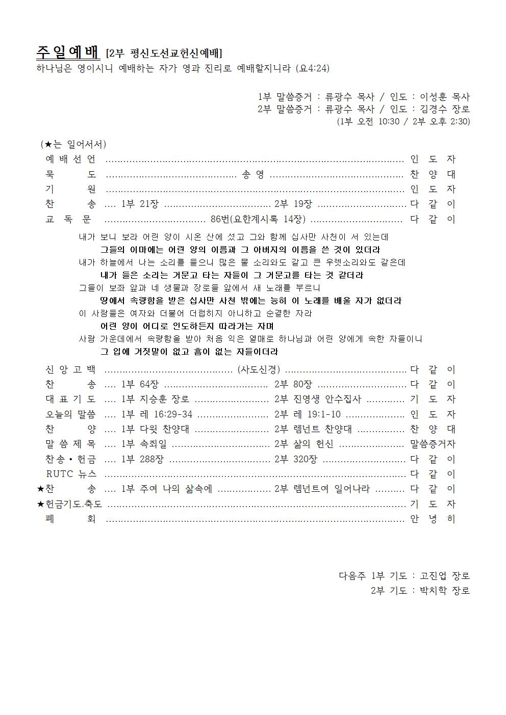 찬송∙헌금 ……. 1부 288장 …………………………… 2부 320장 …………………………. 다 같 이