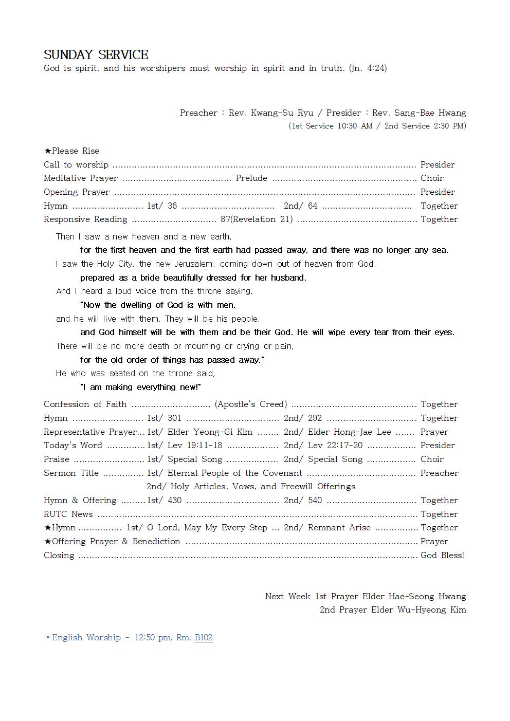 Preacher : Rev. Kwang-Su Ryu / Presider : Rev. Sang-Bae Hwang