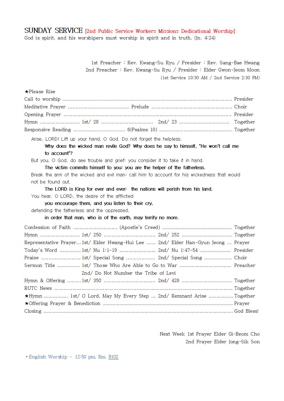 2nd Preacher : Rev. Kwang-Su Ryu / Presider : Elder Gwon-Jeom Moon