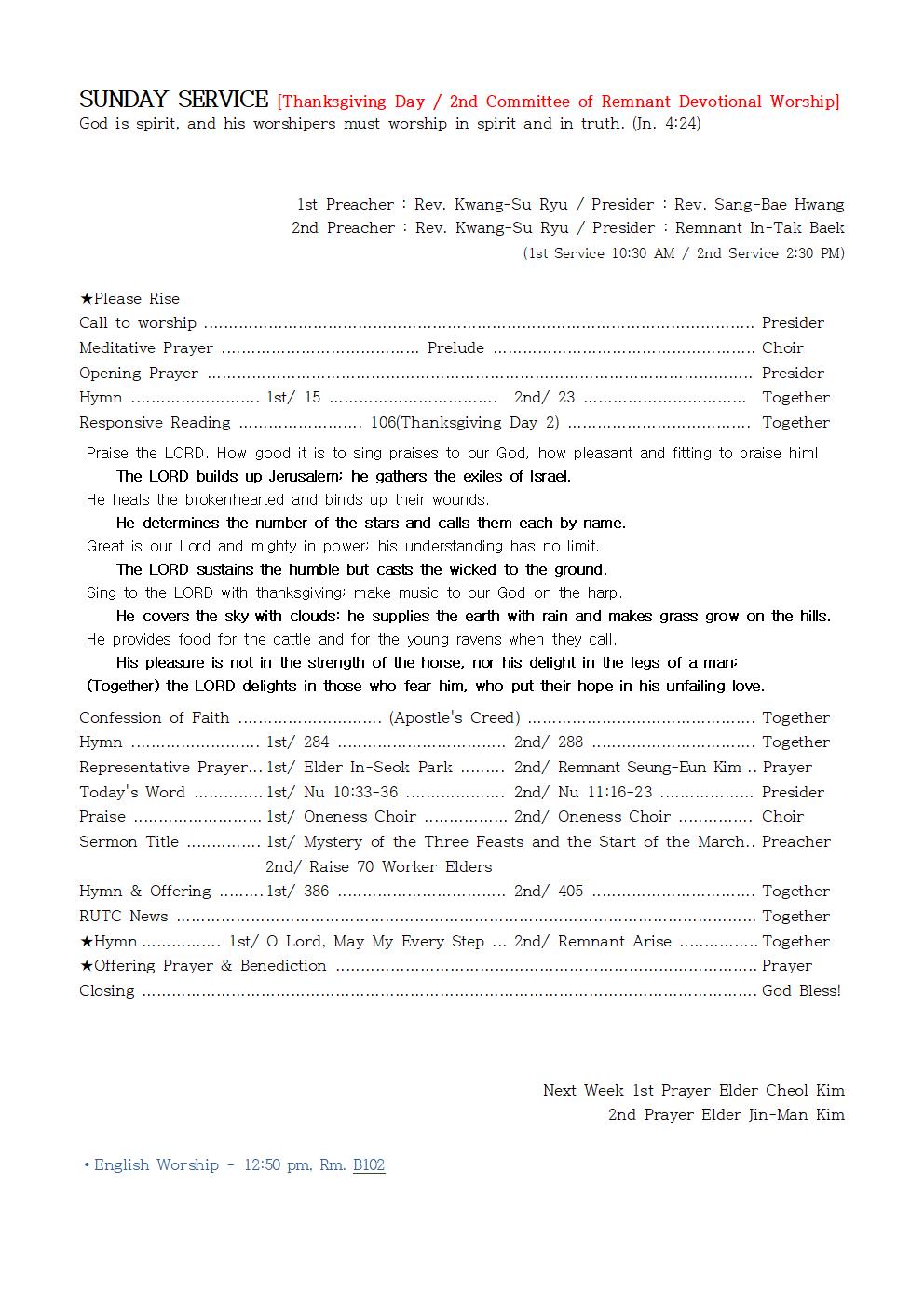 Representative Prayer… 1st/ Elder In-Seok Park …………… 2nd/ Remnant Seung-Eun Kim … Prayer