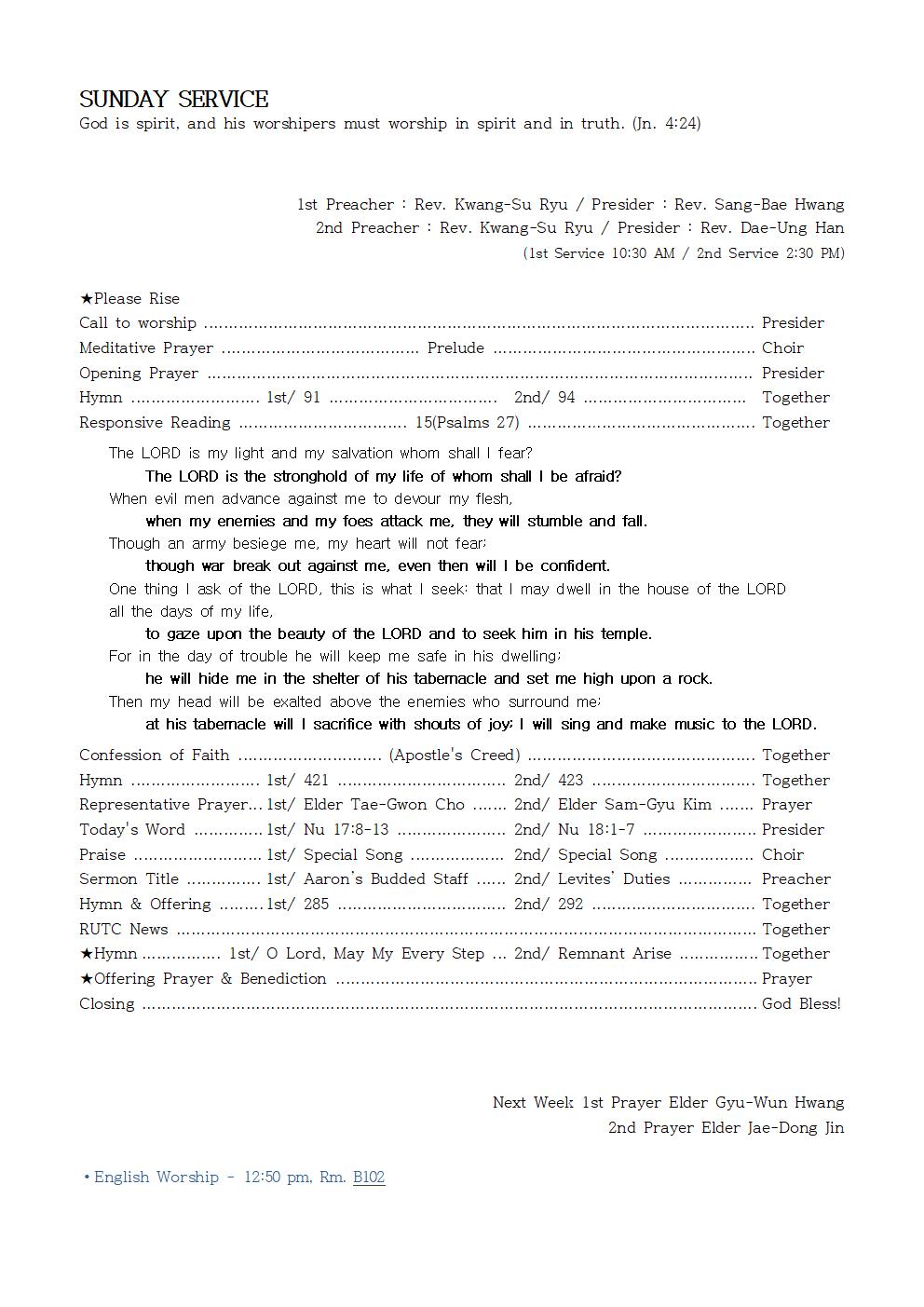 1st Preacher : Rev. Kwang-Su Ryu / Presider : Rev. Sang-Bae Hwang