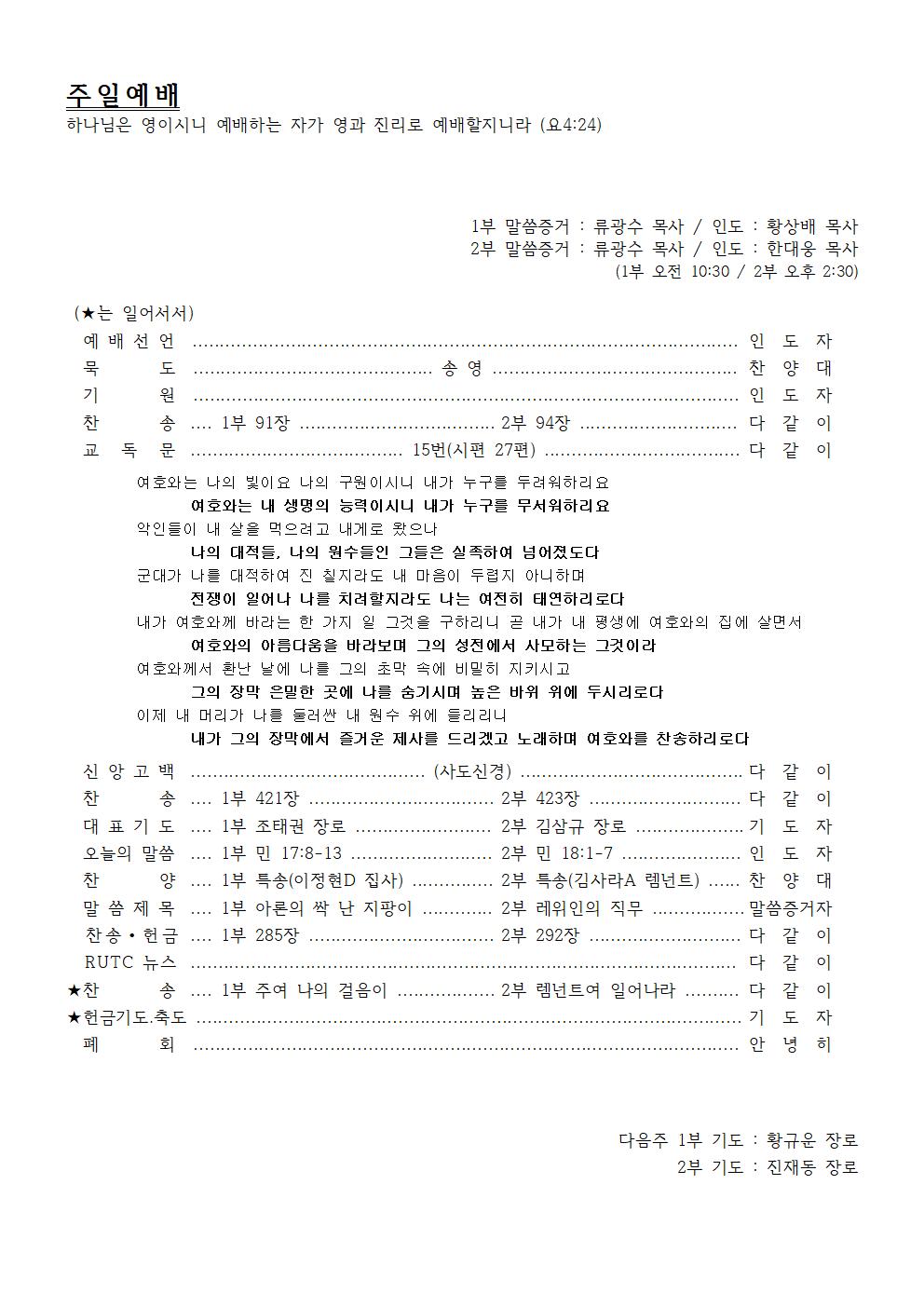 찬송∙헌금 …… 1부 285장 ……………………………. 2부 292장 ……………………….. 다 같 이