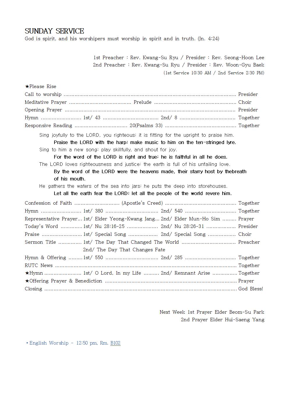 Representative Prayer…. 1st/ Elder Yeong-Kwang Jang…. 2nd/ Elder Mun-Ho Sim ……… Prayer