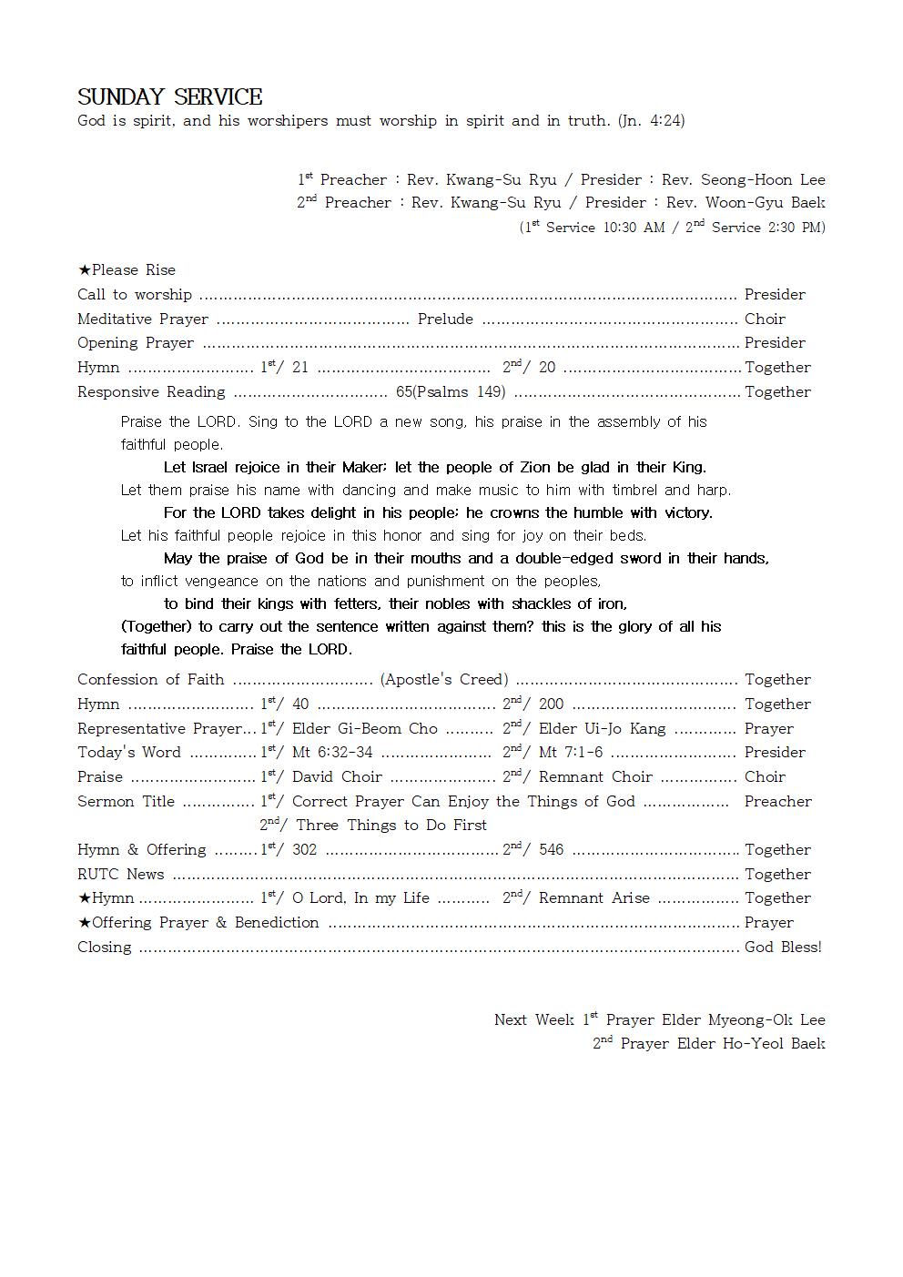 Representative Prayer… 1st/ Elder Gi-Beom Cho ………. 2nd/ Elder Ui-Jo Kang …………. Prayer