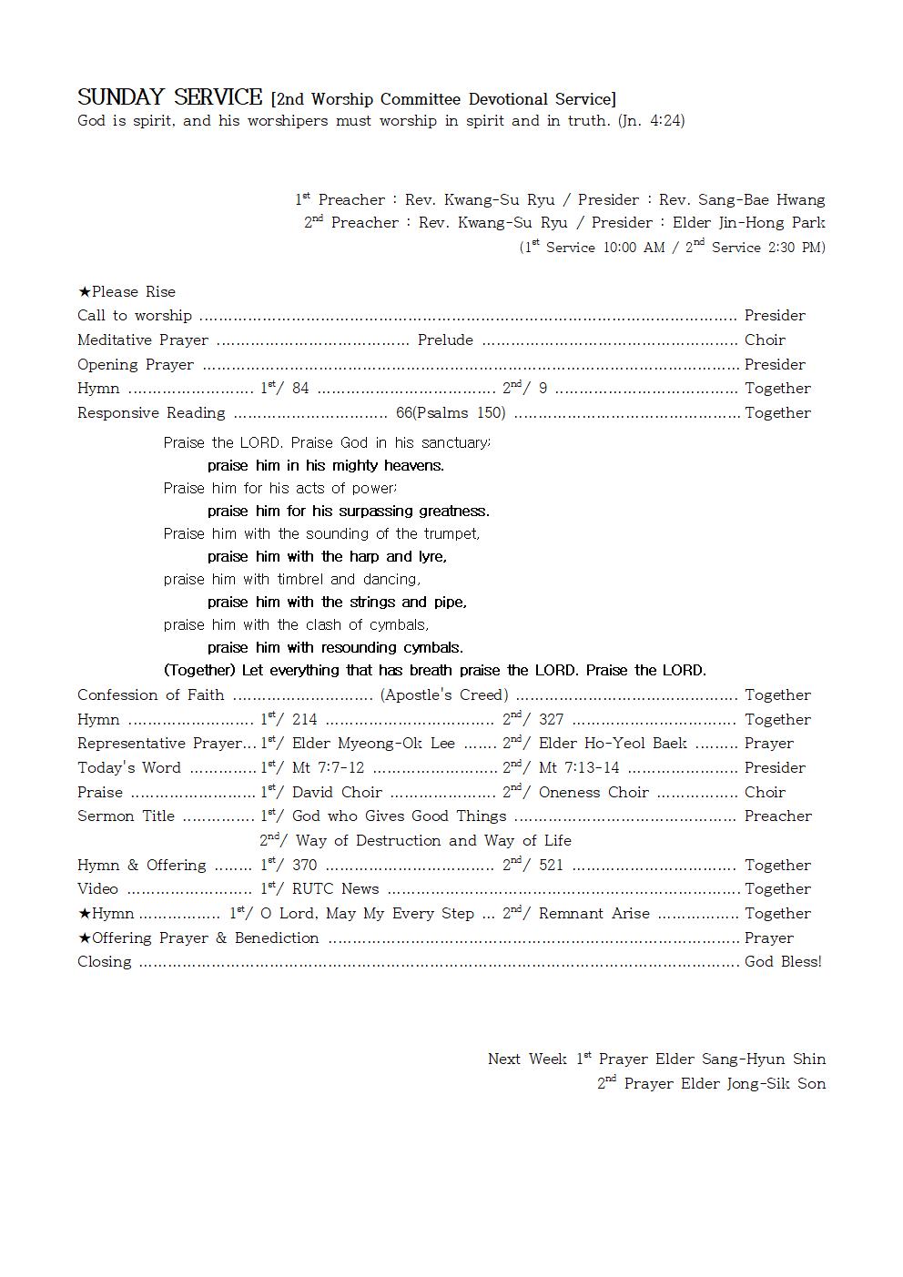 2nd Preacher : Rev. Kwang-Su Ryu / Presider : Elder Jin-Hong Park