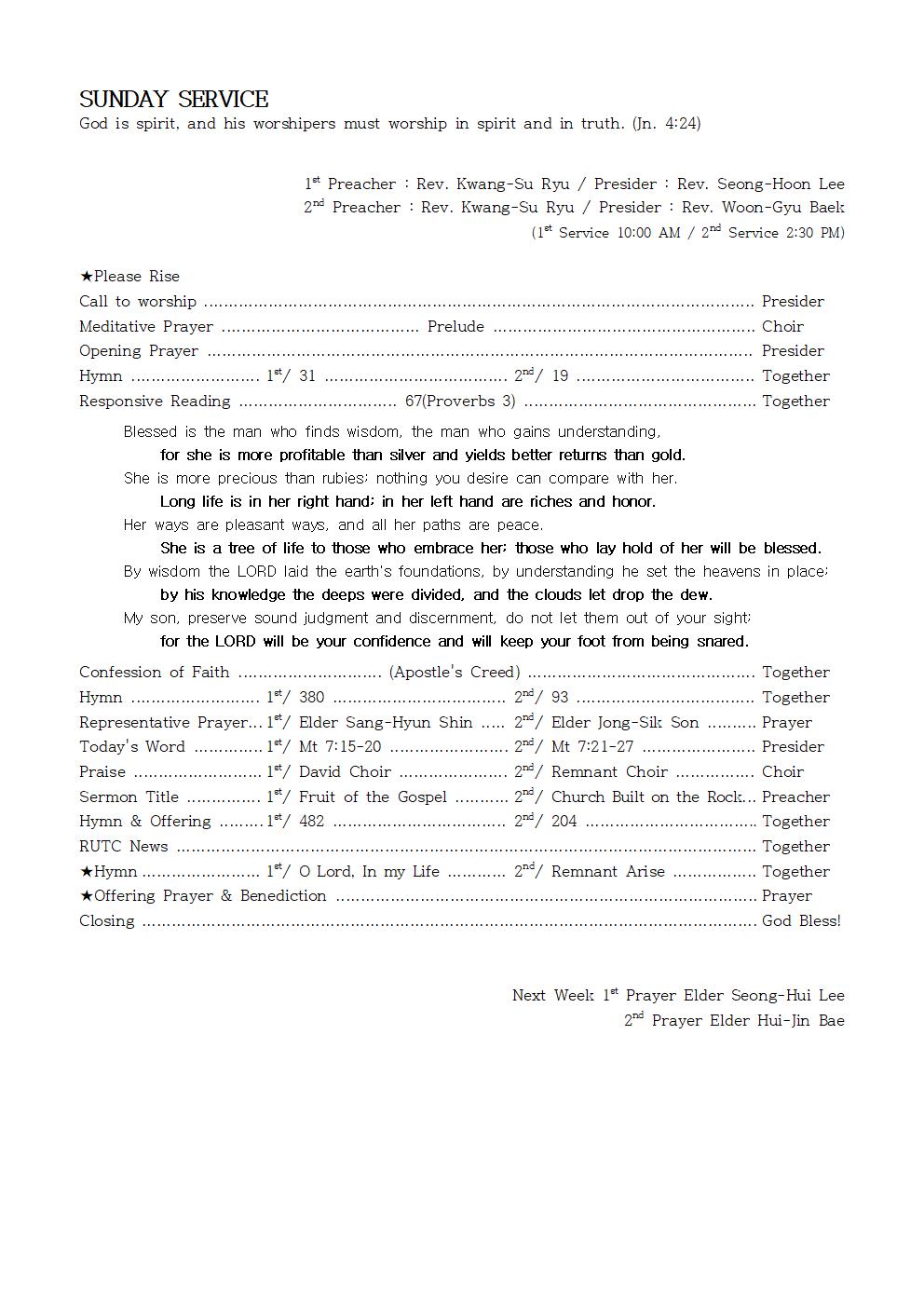 1st Preacher : Rev. Kwang-Su Ryu / Presider : Rev. Seong-Hoon Lee