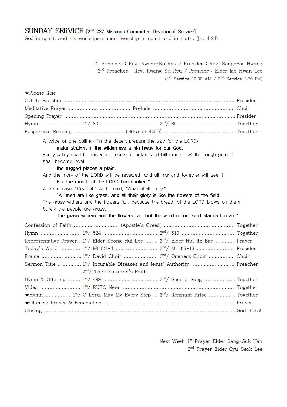 2nd Preacher : Rev. Kwang-Su Ryu / Presider : Elder Jae-Hwan Lee