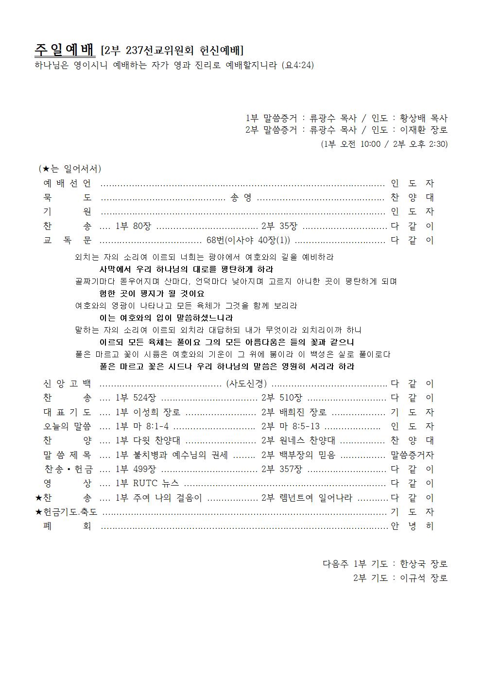 찬         송 …. 1부 524장 ……………………………. 2부 510장 ………………………. 다 같 이