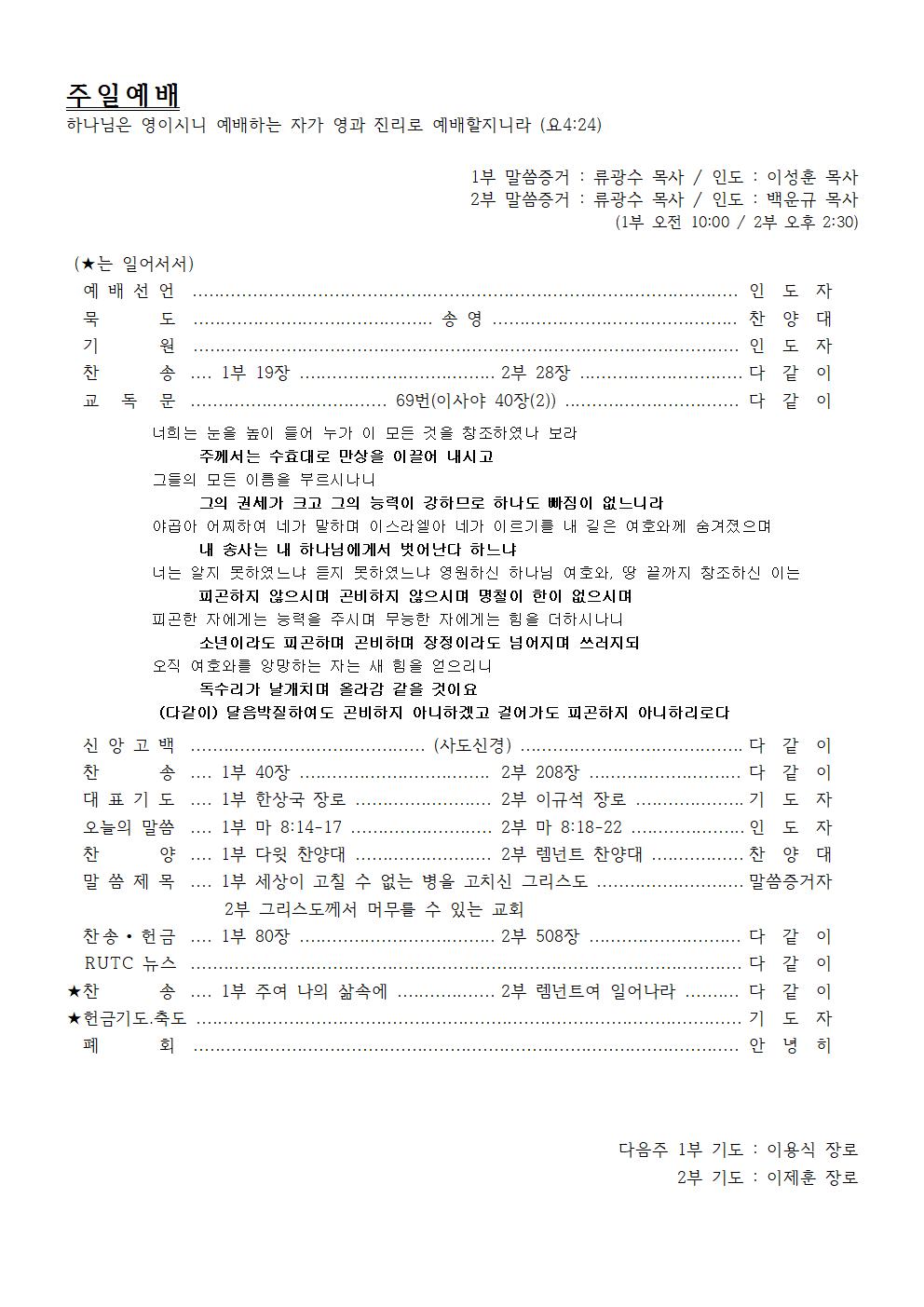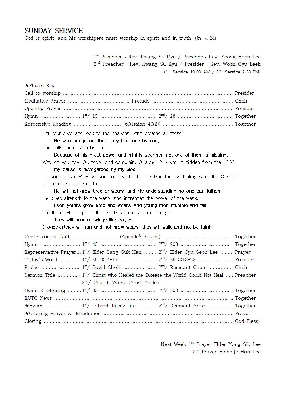 2nd Preacher : Rev. Kwang-Su Ryu / Presider : Rev. Woon-Gyu Baek