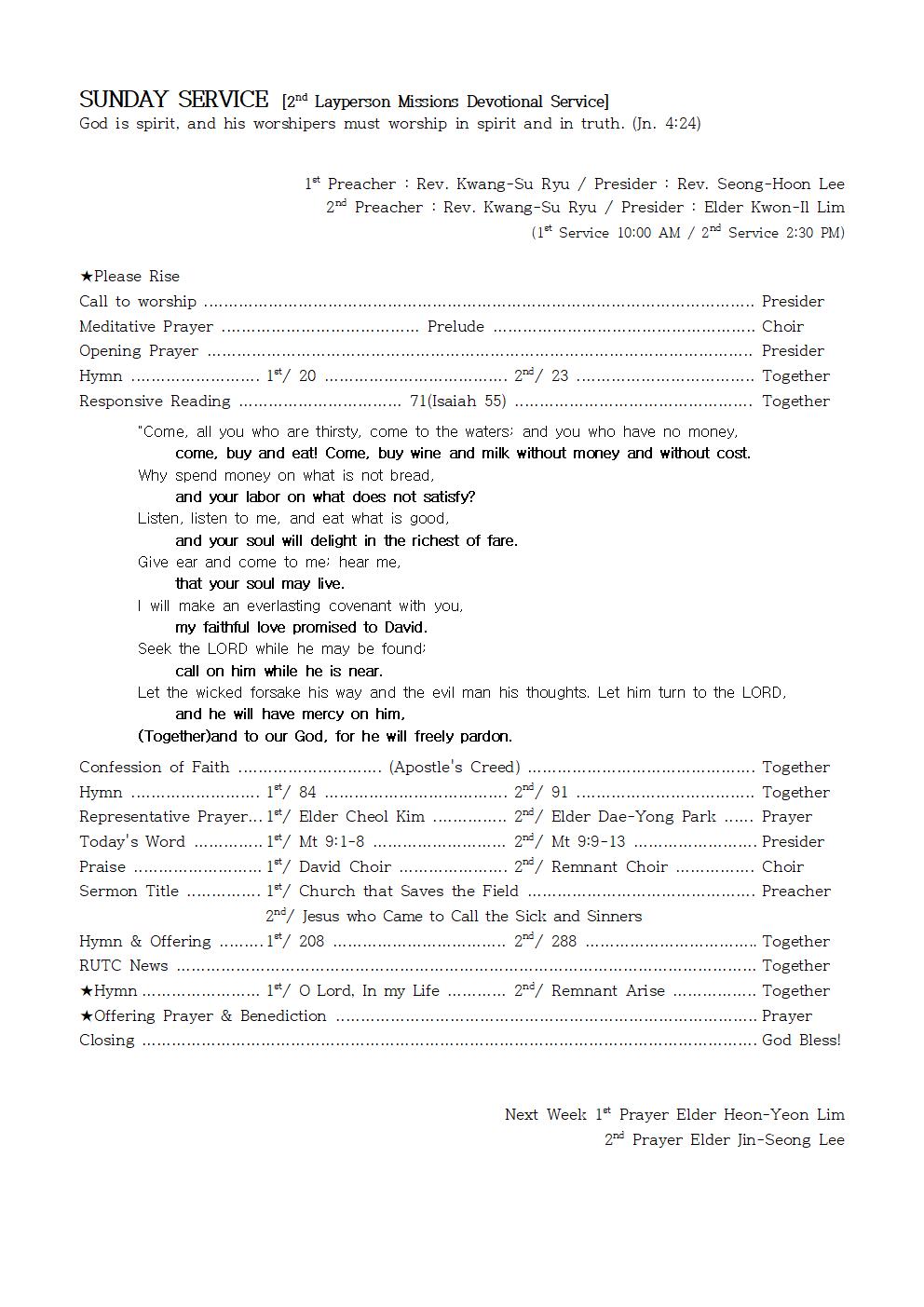 2nd Preacher : Rev. Kwang-Su Ryu / Presider : Elder Kwon-Il Lim
