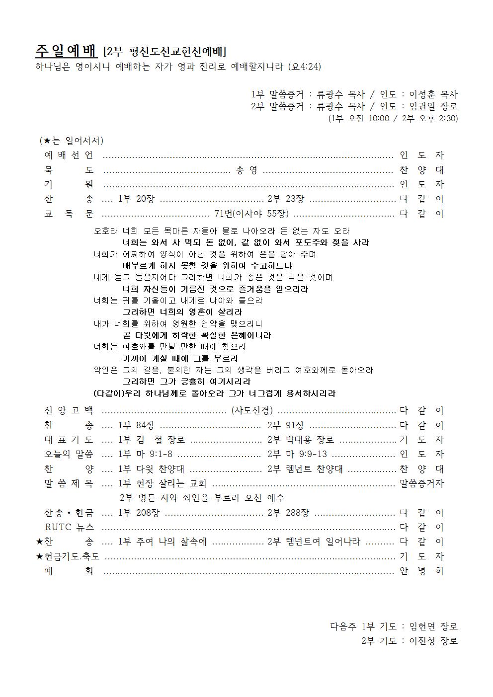 찬         송 …. 1부 20장 ……………………………… 2부 23장 ………………………… 다 같 이