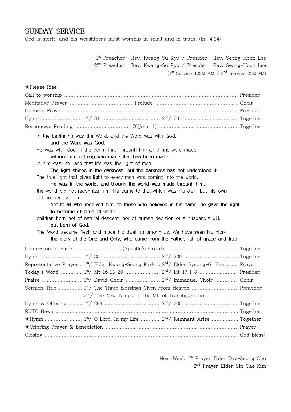 Next Week 1st Prayer Elder Dae-Seong Cho