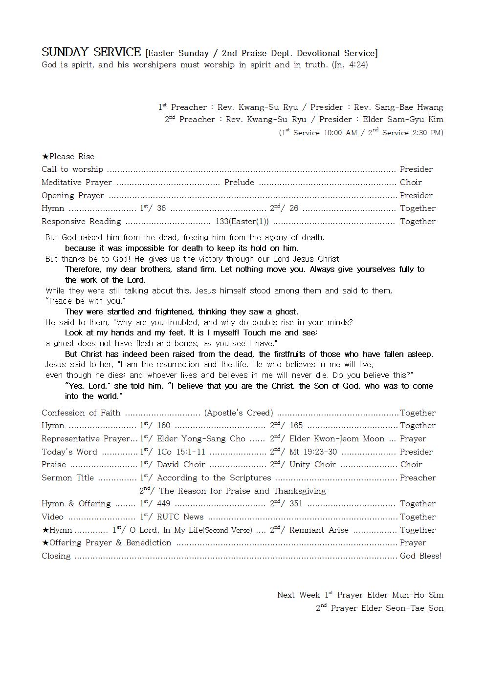 2nd Preacher : Rev. Kwang-Su Ryu / Presider : Elder Sam-Gyu Kim