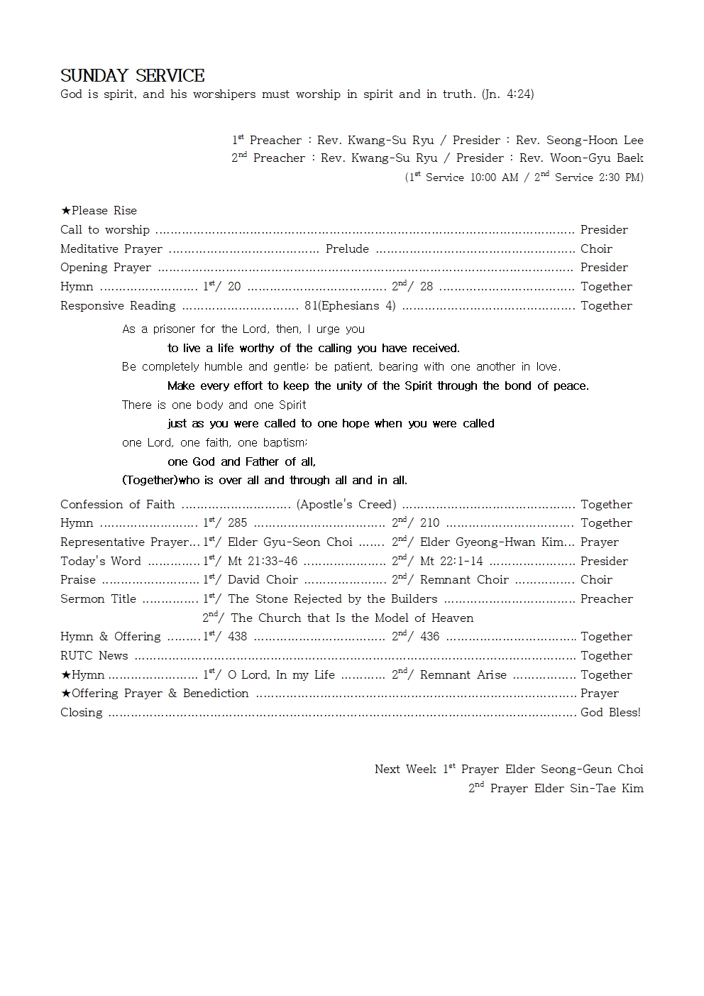 1st Preacher : Rev. Kwang-Su Ryu / Presider : Rev. Seong-Hoon Lee