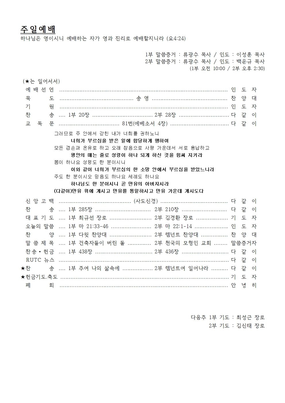 찬송∙헌금 …. 1부 438장 ……………………………. 2부 436장 ………………………. 다 같 이