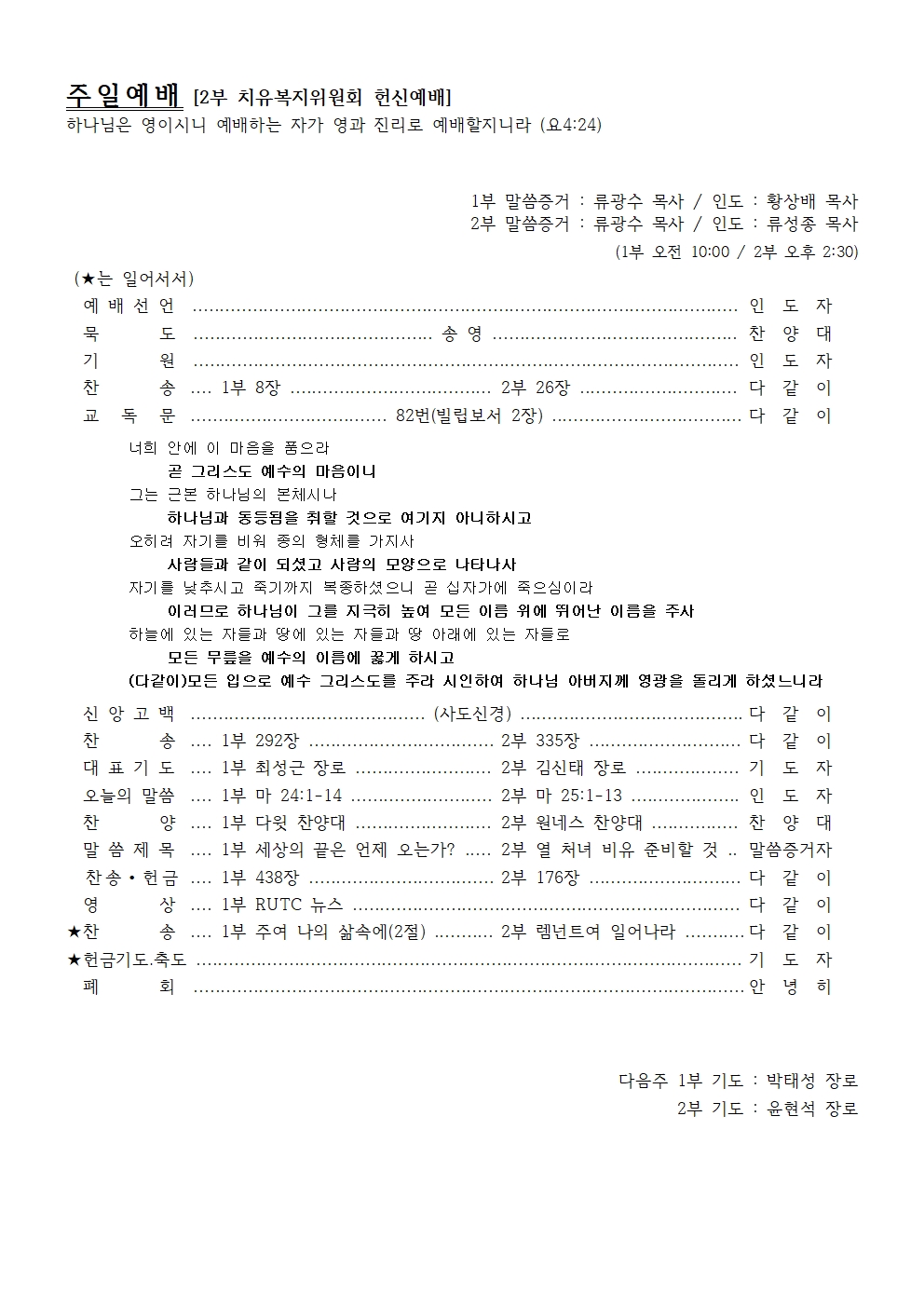 찬         송 …. 1부 8장 ………………………………. 2부 26장 ……………………….. 다 같 이