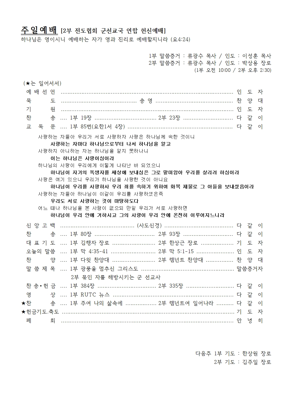 찬 송 …. 1부 19장 ……………………………… 2부 23장 ……………………….. 다 같 이