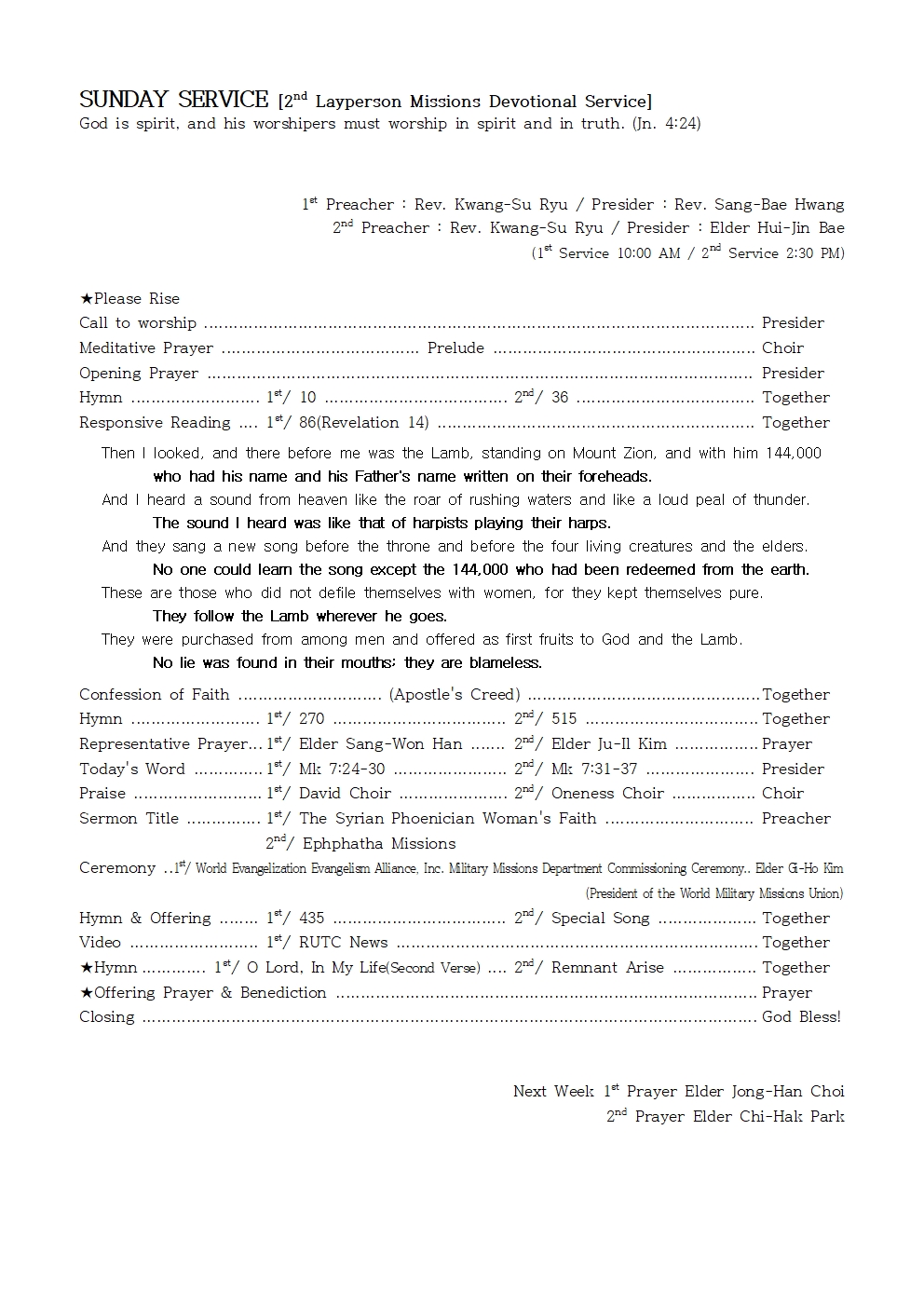 Next Week 1st Prayer Elder Jong-Han Choi