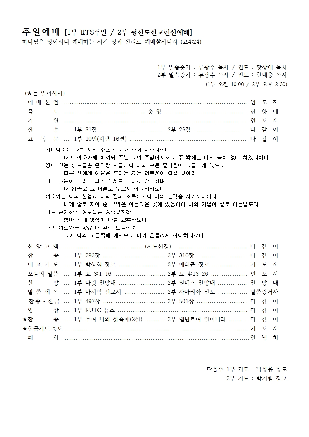 찬         송 …. 1부 31장 ……………………………… 2부 26장 ……………………….. 다 같 이