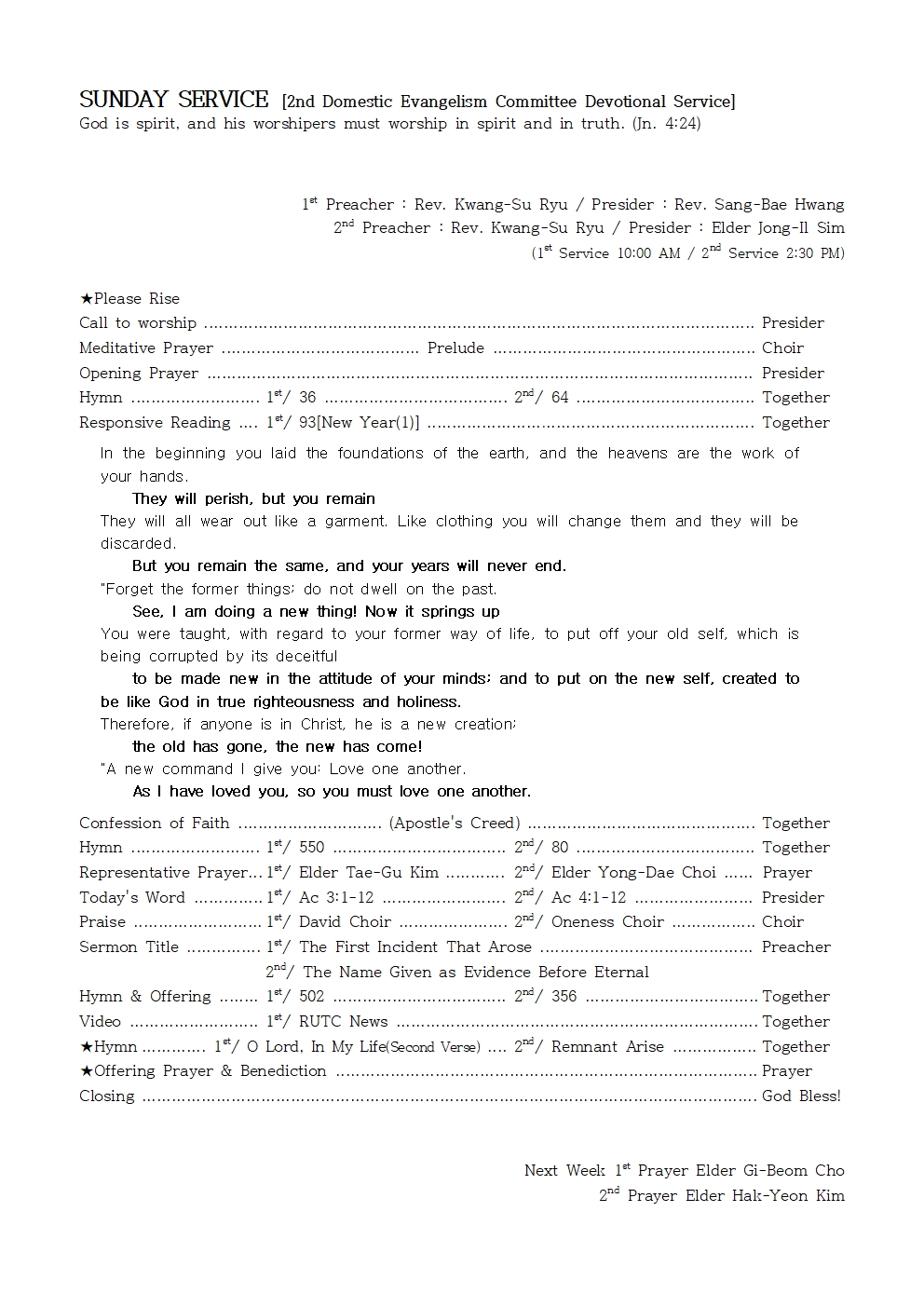 2nd Preacher : Rev. Kwang-Su Ryu / Presider : Elder Jong-Il Sim