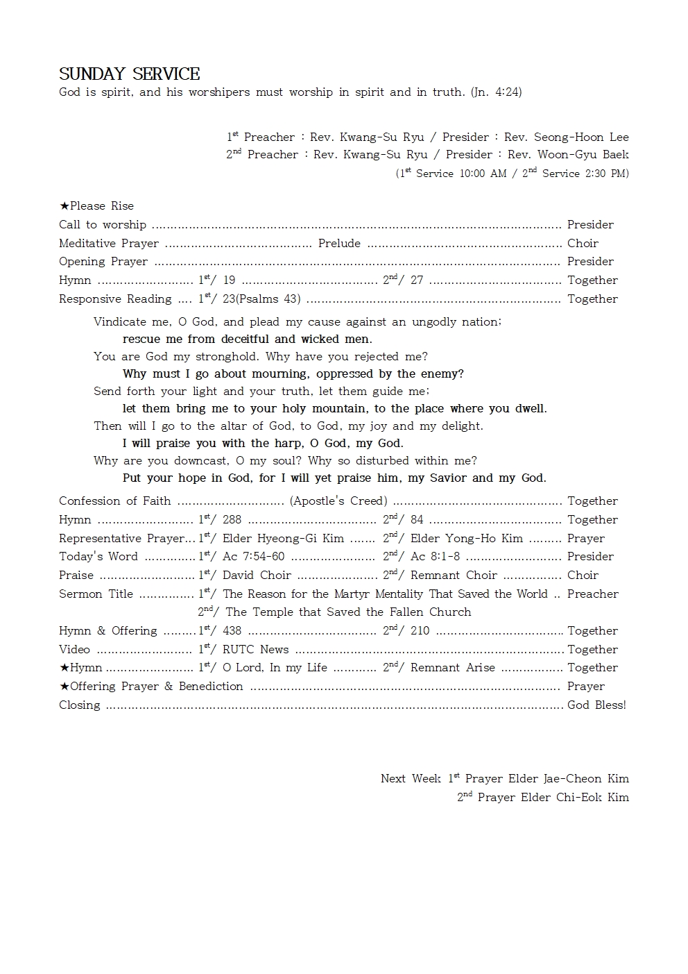 1st Preacher : Rev. Kwang-Su Ryu / Presider : Rev. Seong-Hoon Lee