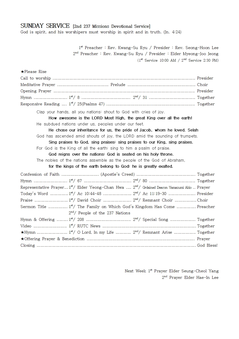 2nd Preacher : Rev. Kwang-Su Ryu / Presider : Elder Myeong-Joo Jeong