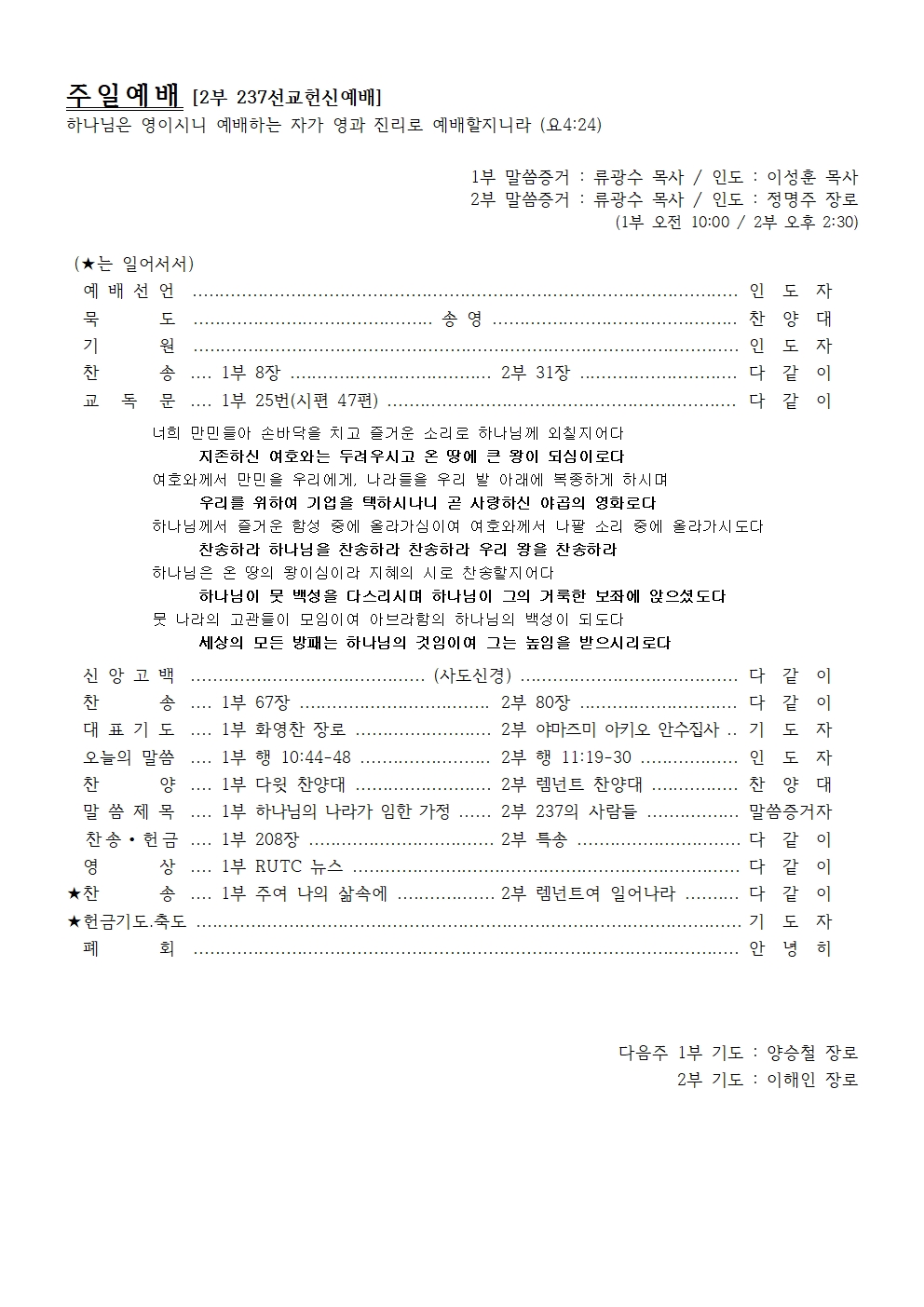 말 씀 제 목 …. 1부 하나님의 나라가 임한 가정 …… 2부 237의 사람들 …………….. 말씀증거자