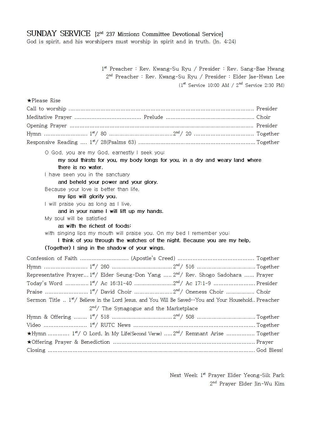 2nd Preacher : Rev. Kwang-Su Ryu / Presider : Elder Jae-Hwan Lee