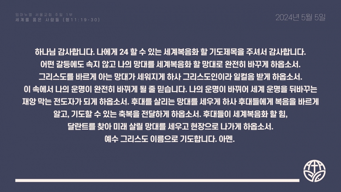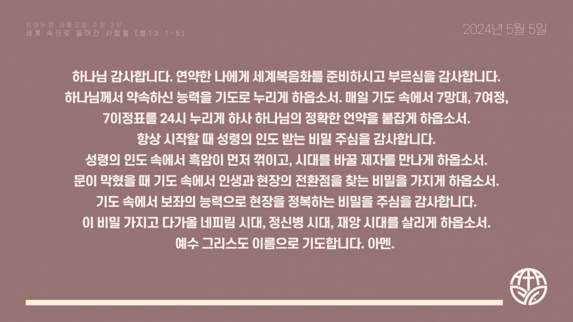 임마누엘 서울교회 성전건축을 위한 요일별 기도내용