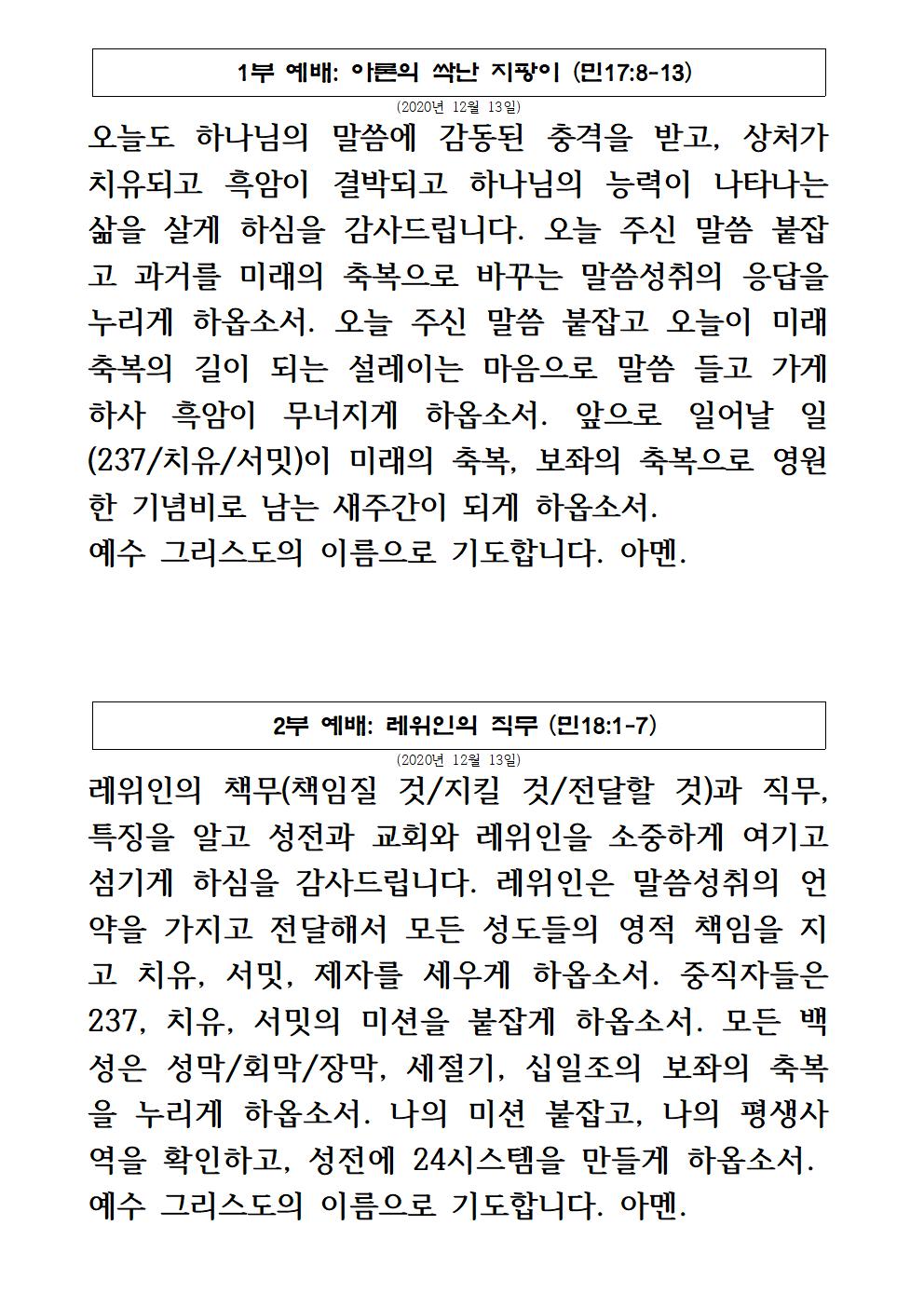 2020년 12월 13일 주일예배 기도제목 – 한국어