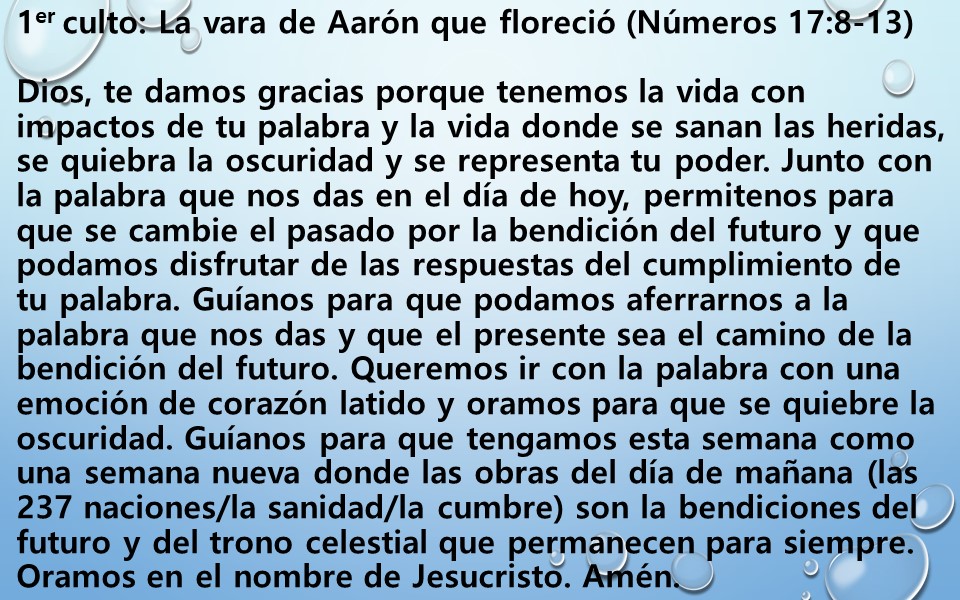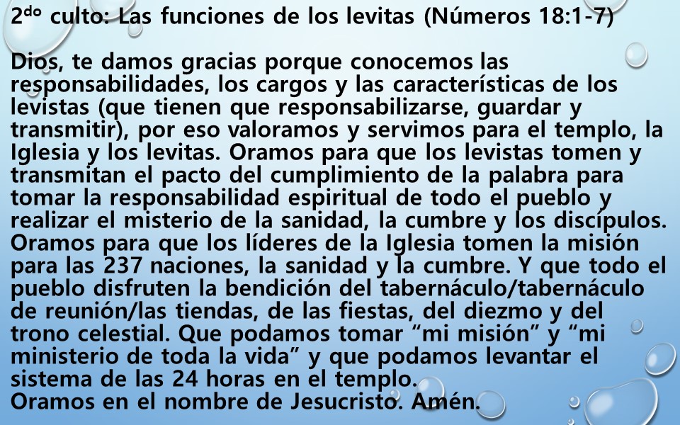 Dios, te damos gracias porque conocemos las responsabilidades, los cargos y las características de los levistas (que tienen que responsabilizarse, guardar y transmitir), por eso valoramos y servimos para el templo, la Iglesia y los levitas. Oramos para que los levistas tomen y transmitan el pacto del cumplimiento de la palabra para tomar la responsabilidad espiritual de todo el pueblo y realizar el misterio de la sanidad, la cumbre y los discípulos. Oramos para que los líderes de la Iglesia tomen la misión para las 237 naciones, la sanidad y la cumbre. Y que todo el pueblo disfruten la bendición del tabernáculo/tabernáculo de reunión/las tiendas, de las fiestas, del diezmo y del trono celestial. Que podamos tomar “mi misión” y “mi ministerio de toda la vida” y que podamos levantar el sistema de las 24 horas en el templo. Oramos en el nombre de Jesucristo. Amén.