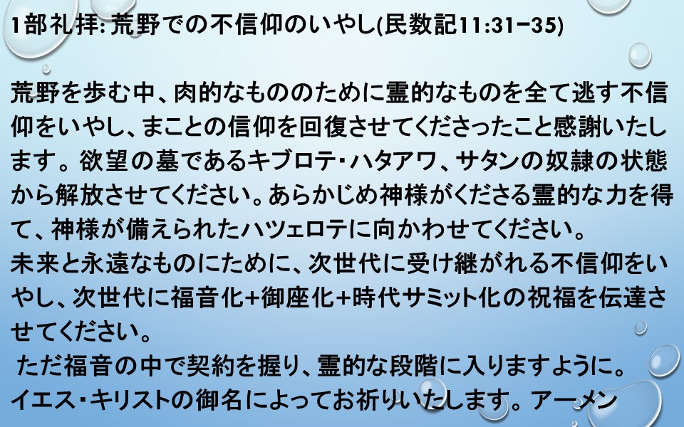 欲望の墓であるキブロテ・ハタアワ、サタンの奴隷の状態から解放させてください。あらかじめ神様がくださる霊的な力を得て、神様が備えられたハツェロテに向かわせてください。未来と永遠なものにために、次世代に受け継がれる不信仰をいやし、次世代に福音化+御座化+時代サミット化の祝福を伝達させてください。