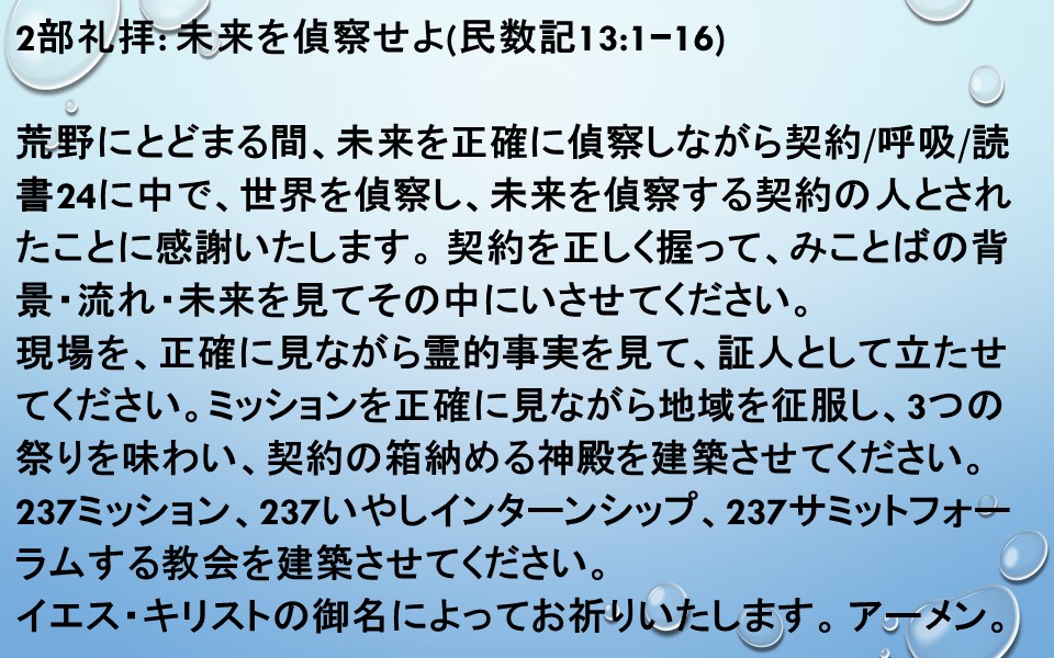 契約を正しく握って、みことばの背景・流れ・未来を見てその中にいさせてください。現場を、正確に見ながら霊的事実を見て、証人として立たせてください。ミッションを正確に見ながら地域を征服し、3つの祭りを味わい、契約の箱納める神殿を建築させてください。237ミッション、237いやしインターンシップ、237サミットフォーラムする教会を建築させてください。