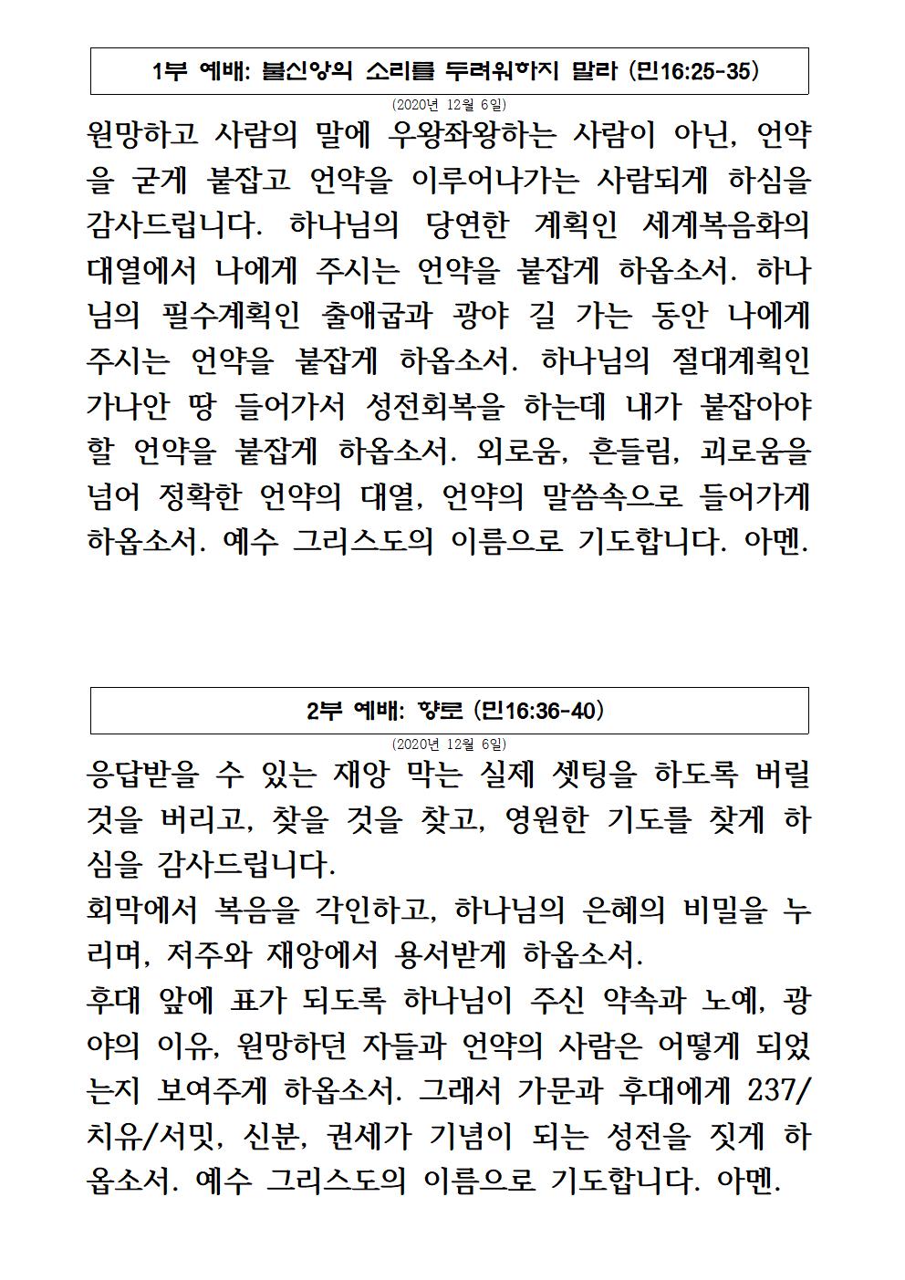 2020년 12월 6일 주일예배 기도제목 – 한국어