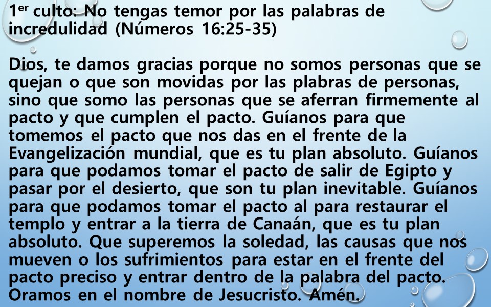 Dios, te damos gracias porque no somos personas que se quejan o que son movidas por las plabras de personas, sino que somo las personas que se aferran firmemente al pacto y que cumplen el pacto. Guíanos para que tomemos el pacto que nos das en el frente de la Evangelización mundial, que es tu plan absoluto. Guíanos para que podamos tomar el pacto de salir de Egipto y pasar por el desierto, que son tu plan inevitable. Guíanos para que podamos tomar el pacto al para restaurar el templo y entrar a la tierra de Canaán, que es tu plan absoluto. Que superemos la soledad, las causas que nos mueven o los sufrimientos para estar en el frente del pacto preciso y entrar dentro de la palabra del pacto. Oramos en el nombre de Jesucristo. Amén.