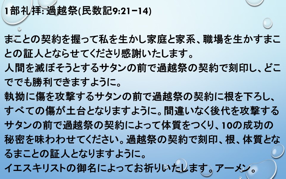 執拗に傷を攻撃するサタンの前で過越祭の契約に根を下ろし、すべての傷が土台となりますように。間違いなく後代を攻撃するサタンの前で過越祭の契約によって体質をつくり、10の成功の秘密を味わわせてください。過越祭の契約で刻印、根、体質となるまことの証人となりますように。