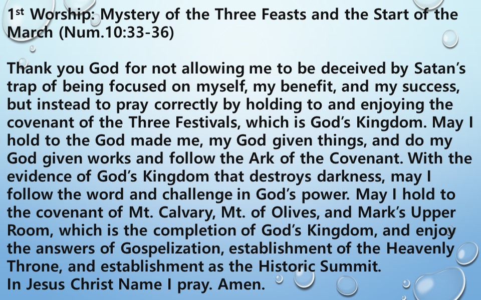 Thank you God for not allowing me to be deceived by Satan’s trap of being focused on myself, my benefit, and my success, but instead to pray correctly by holding to and enjoying the covenant of the Three Festivals, which is God’s Kingdom.