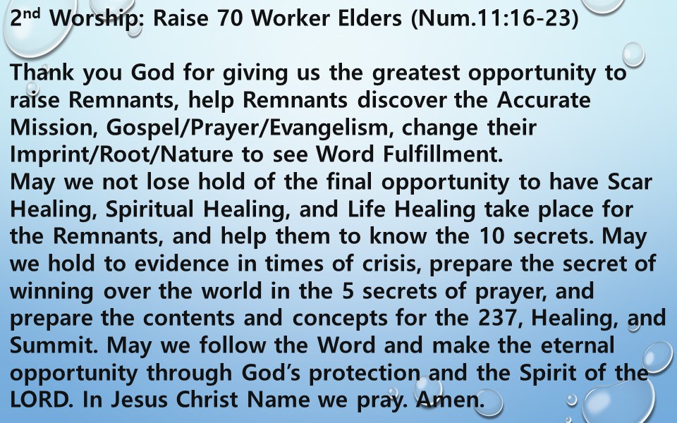 May we not lose hold of the final opportunity to have Scar Healing, Spiritual Healing, and Life Healing take place for the Remnants, and help them to know the 10 secrets. May we hold to evidence in times of crisis, prepare the secret of winning over the world in the 5 secrets of prayer, and prepare the contents and concepts for the 237, Healing, and Summit. May we follow the Word and make the eternal opportunity through God’s protection and the Spirit of the LORD. In Jesus Christ Name we pray. Amen.
