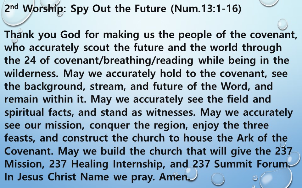 Thank you God for making us the people of the covenant, who accurately scout the future and the world through the 24 of covenant/breathing/reading while being in the wilderness.