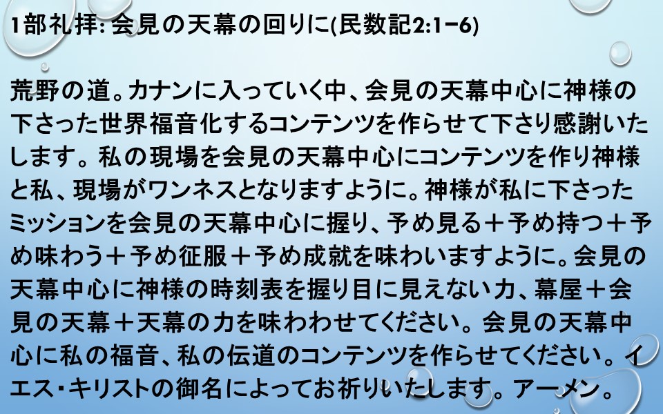 私の現場を会見の天幕中心にコンテンツを作り神様と私、現場がワンネスとなりますように。神様が私に下さったミッションを会見の天幕中心に握り、予め見る+予め持つ+予め味わう+予め征服+予め成就を味わいますように。会見の天幕中心に神様の時刻表を握り目に見えない力、幕屋+会見の天幕+天幕の力を味わわせてください。