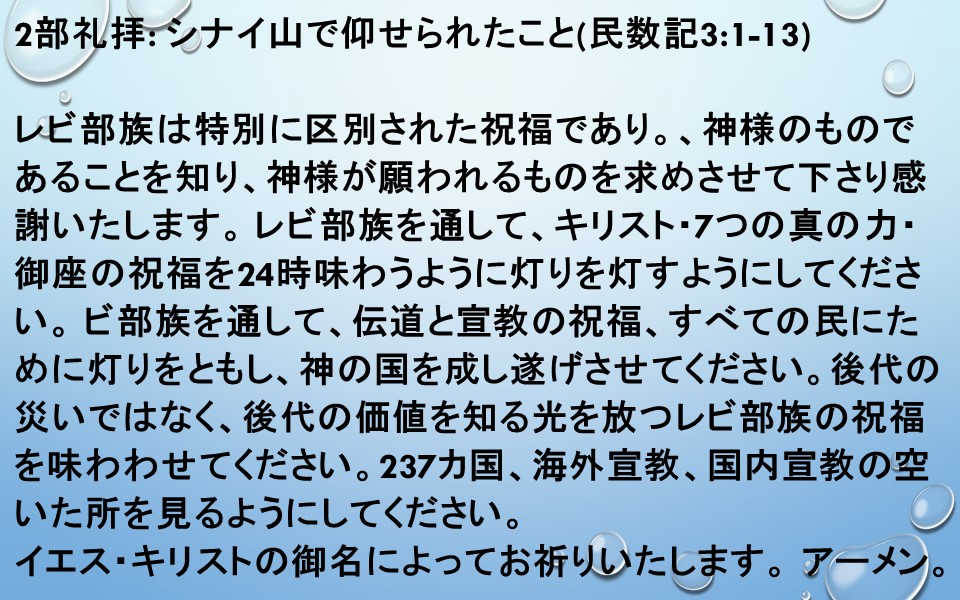 レビ部族を通して、伝道と宣教の祝福、すべての民にために灯りをともし、神の国を成し遂げさせてください。後代の災いではなく、後代の価値を知る光を放つレビ部族の祝福を味わわせてください。237カ国、海外宣教、国内宣教の空いた所を見るようにしてください。