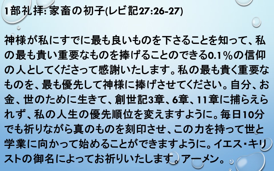 私の最も貴く重要なものを、最も優先して神様に捧げさせてください。自分、お金、世のために生きて、創世記3章、6章、11章に捕らえられず、私の人生の優先順位を変えますように。毎日10分でも祈りながら真のものを刻印させ、この力を持って世と学業に向かって始めることができますように。